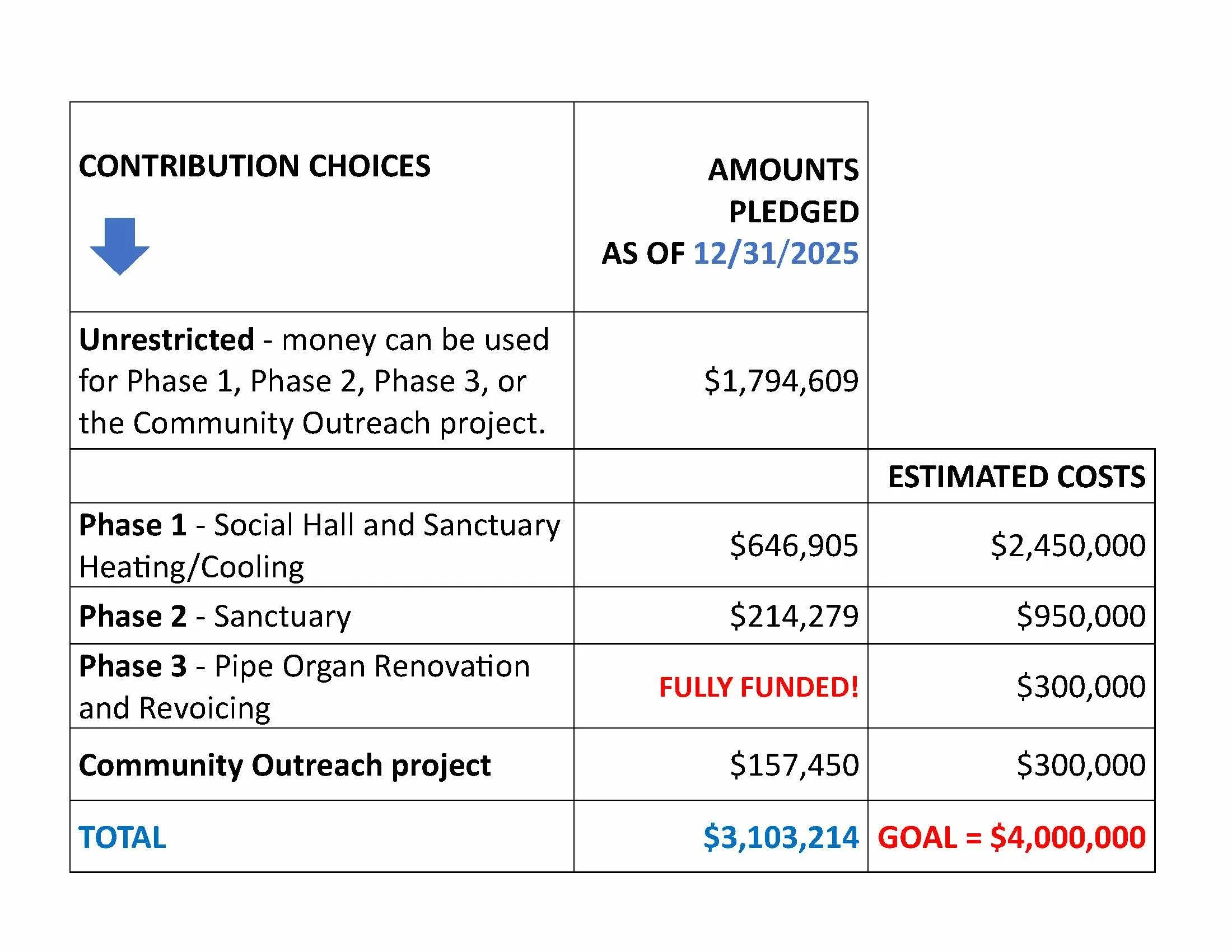 Phase II: Sanctuary Modernization. This phase addresses the need for a safer, more accessible and extended chancel that allows for wider steps, an integrated ramp, a safer and integrated choir loft, and realigned pews that are more accessible and comfortable. The Capital Campaign design committee is currently reviewing architectural plans and budgets for moving forward with this phase in 2026.