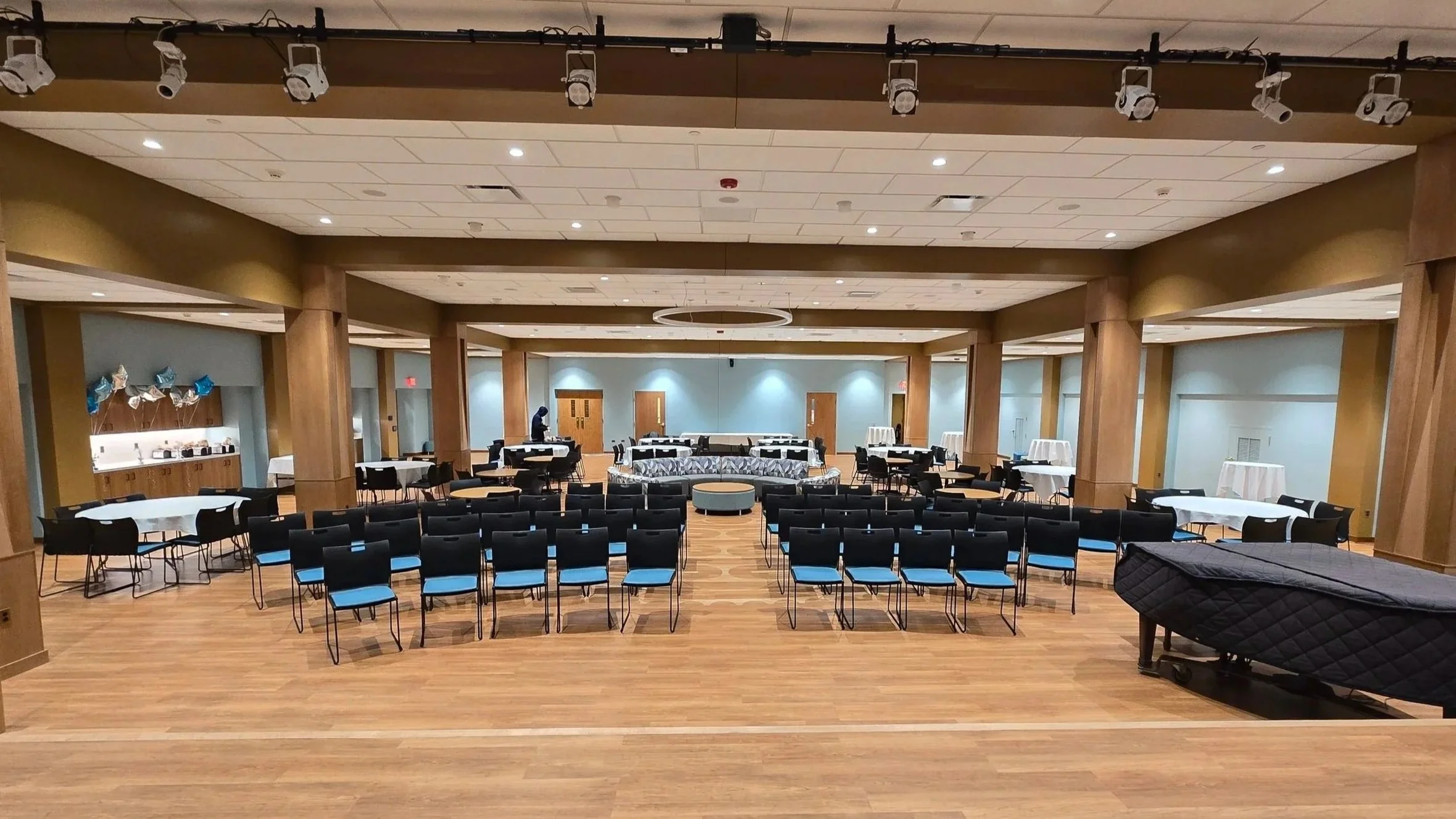Phase 1 of our Capital Campaign — the renovation of Snider Social Hall — was completed in December 2025. Phase 1 transformed our Social Hall into a modern, well-lit space with an uplifting interior design, air conditioning (for the first time!), a new stage, state-of-the-art audio-visual equipment, and a new labyrinth inlaid into the floor.