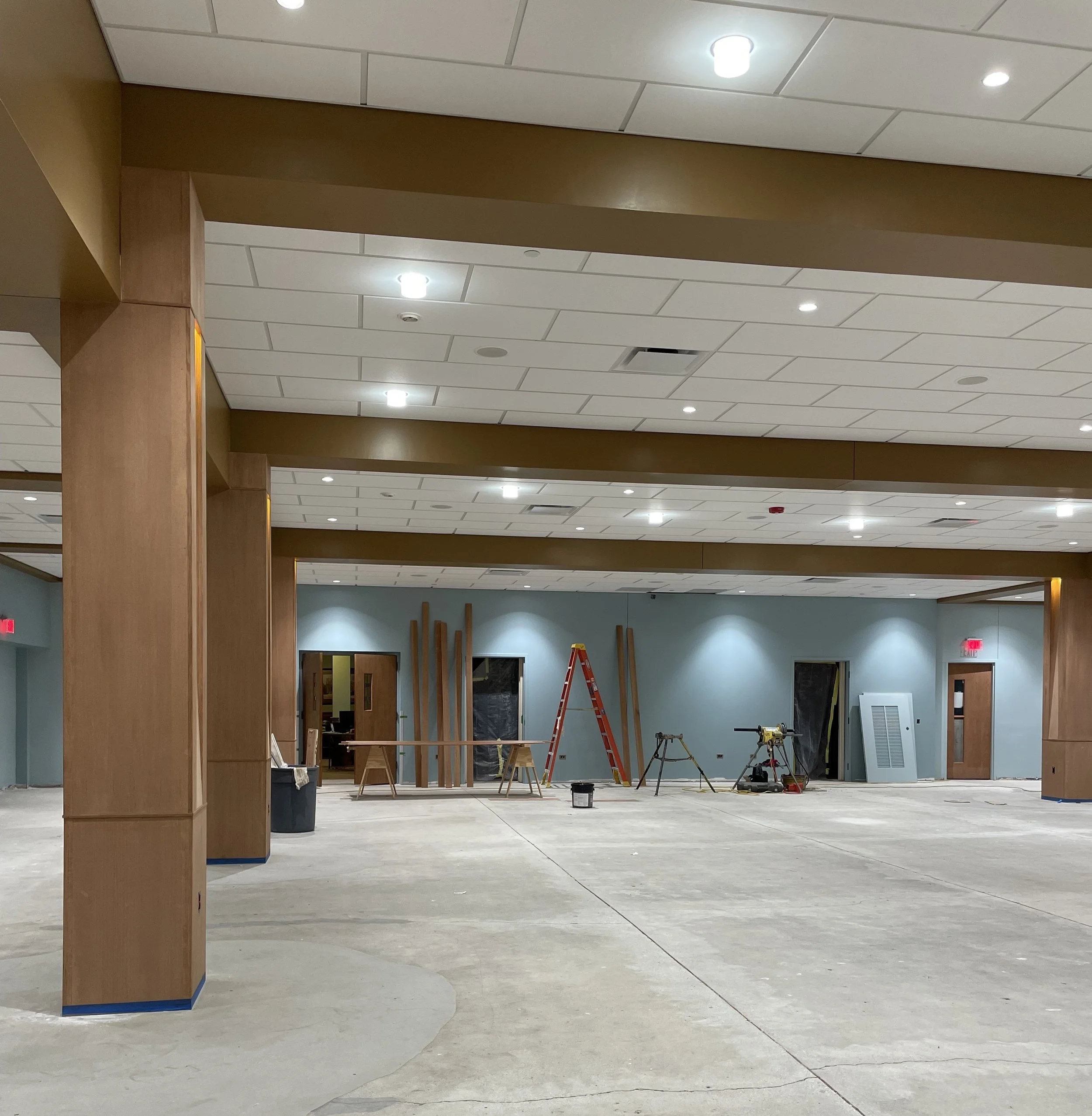 Social Hall renovations are scheduled to be completed at the end of 2025. This progress shot from mid-November shows completion of all ceiling work, lighting, painting of walls and beams, and staining of all columns. In addition, the Social Hall stage has been completed, updated audio-video equipment has been installed, the beverage bar has been added, and upgrades to the HVAC system have been made. The final task: installing the luxury vinyl plank (LVP) flooring, which includes a permanent imprint of a labyrinth for walking meditation and prayer.